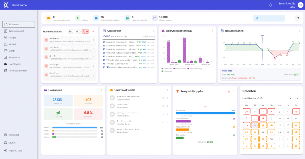 Aloitussivu näyttää tilanteen yhdellä silmäyksellä: huomiota vaativat hakijat, resurssitilanne, rekrytointisuppilo ja viimeisimmät yhteydenotot. Analytiikka-näkymät tarjoavat syvemmän kuvan.